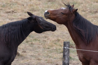 I absolutely love being able to see our horses outside our window!! I catch the most interesting herd interactions. I have no idea what these two were really doing, but from a human perspective it looked like this: